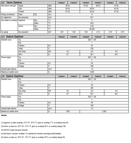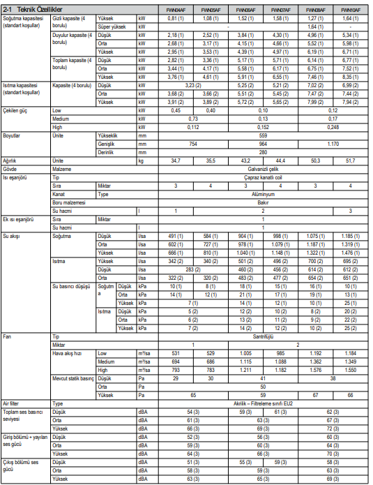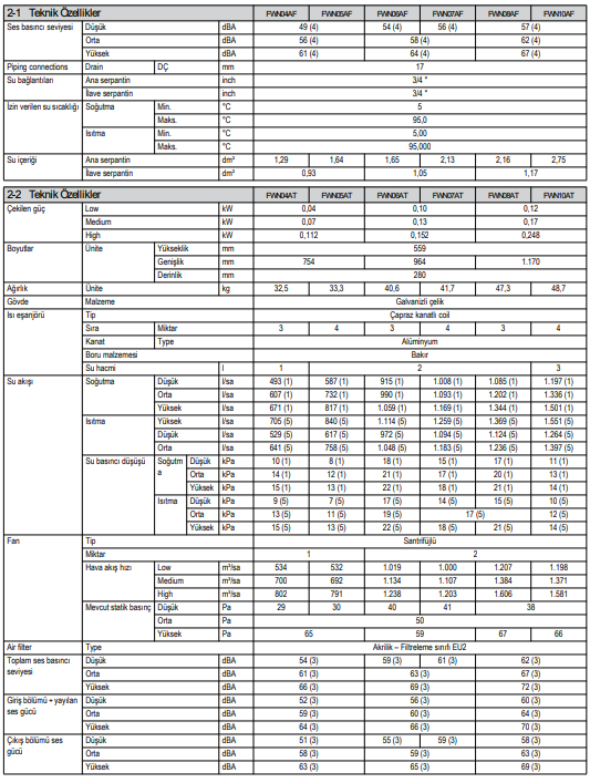 1) Soğutma modu için hava şartı: 27°C KT, %47 -su rejimi: 7°C/ 12°C 2) Isıtma modu için hava şartı:20°C KT – su giriş sıcaklığı 70°C 3) Tabloda belirtilen kapasitelerin fan hızı orta devirde seçilmiştir. 4) Fiyatlarımıza ÖTV dahil, %20 KDV dahil değildir. 5) Ödeme şekli siparişte peşin, ödeme tarihindeki TCMB Döviz Satış Kuru baz alınarak TL’ye çevrilecektir. 6) Yukarıdaki fiyatlara termostat ve aksesuarlar dahil değildir. 7) Her türlü montaj işlemi, devreye alma, elektrik besleme hattı, drenaj işlemleri müşteriye aittir. 8) Cihazlar şantiyede vasıta üzerinde teslim edilecektir.